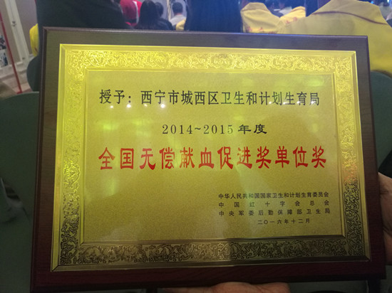 为纪念和庆祝第十四个“世界献血者日”,为感谢无偿献血者的无私奉献,大力弘扬献血者“人道、博爱、奉献”的精神,鼓励更多的人参与无偿献血,青海省卫生和计划生育委员会、青海省精神文明指导委员会办公室、省血液中心、省输血协会于2017年6月9日联合举办了“热血•守护生命的笑容”为主题的献血者见面会及颁奖典礼。城西区卫生和计划生育局在此次活动中荣获了由中华人民共和国国家卫生和计划生育委员会、中国红十字会总会、中央军委后勤保障部卫生局颁发的“2014年至2015年度无偿献血促进奖单位奖”。