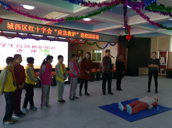 为进一步提高西区广大师生防灾避险、自救互救能力,全面普及应急救护知识,保护生命健康、最大 限度地减少自然灾害等意外事故造成的人身伤害。区红十字会于2017年11月8日在昆仑路小学开展了应 急救护知识进校园活动。