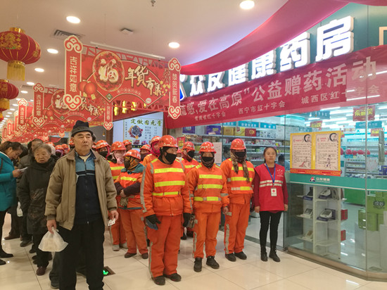 冬春季是流感高发季节,感冒频发,环卫工人长期奋战在室外,极易遭受流感侵袭。2018年1月17日至19 日青海省红十字、西宁市红十字会、城西区红十字会联合开展了主题为“远离流感 ,爱在高原”公益赠药活动。